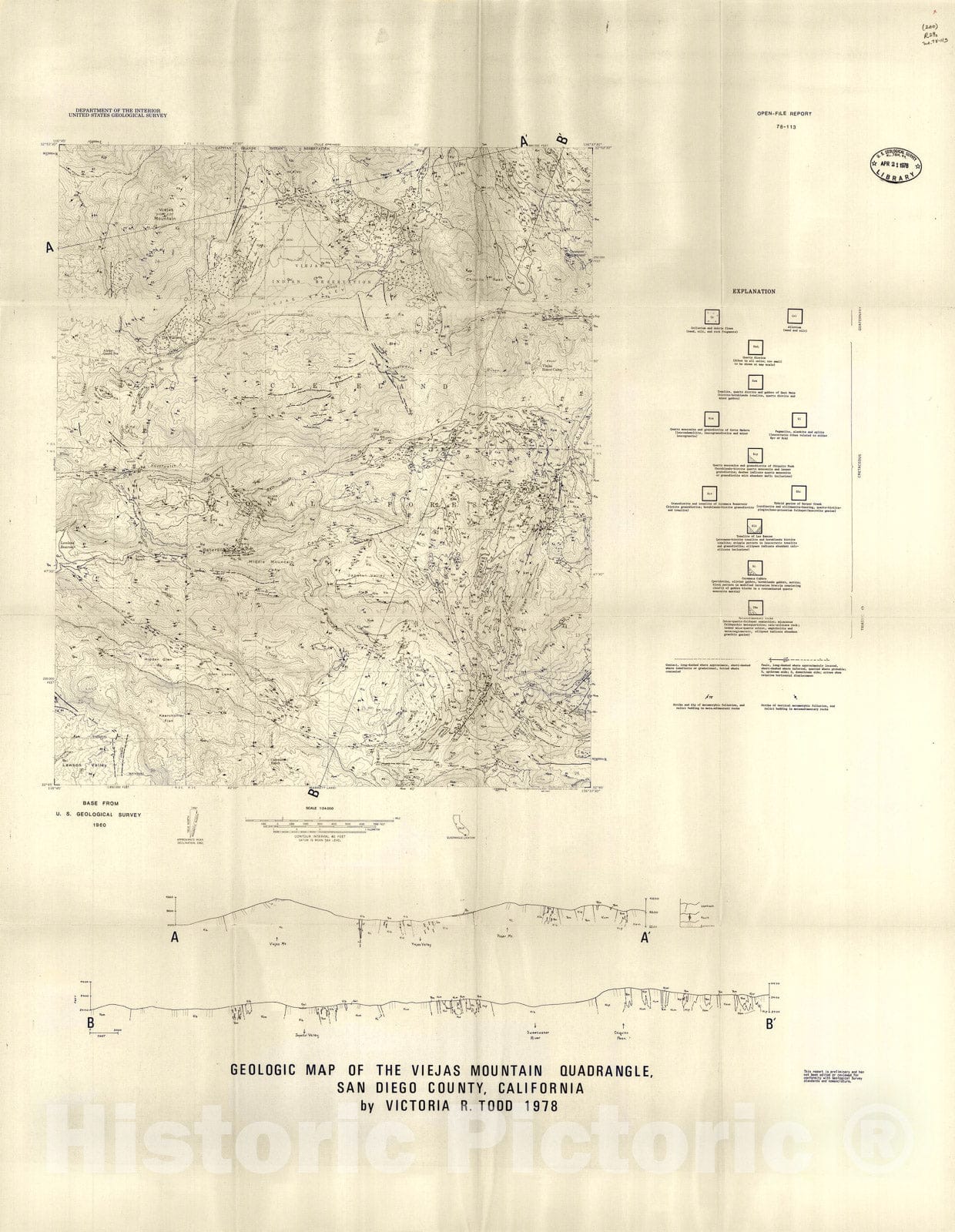 • .Map : Geologic map of the Viejas Mountain quadrangle, San Diego County, California, 1978 Cartography Wall Art :