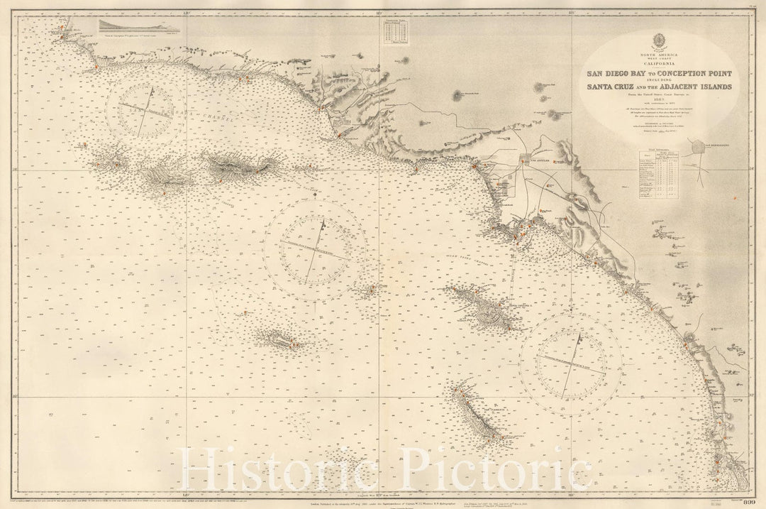 Historic Map - San Diego Bay to Conception Point Including Santa Cruz and Adjacent Islands From the United States Coast Survey to 1883, 1885 - Vintage Wall Art