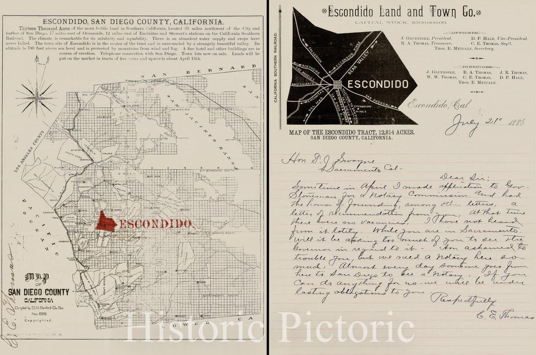 Historic Map - Map of San Diego County California, 1886, Escondido Land and Town Company - Vintage Wall Art