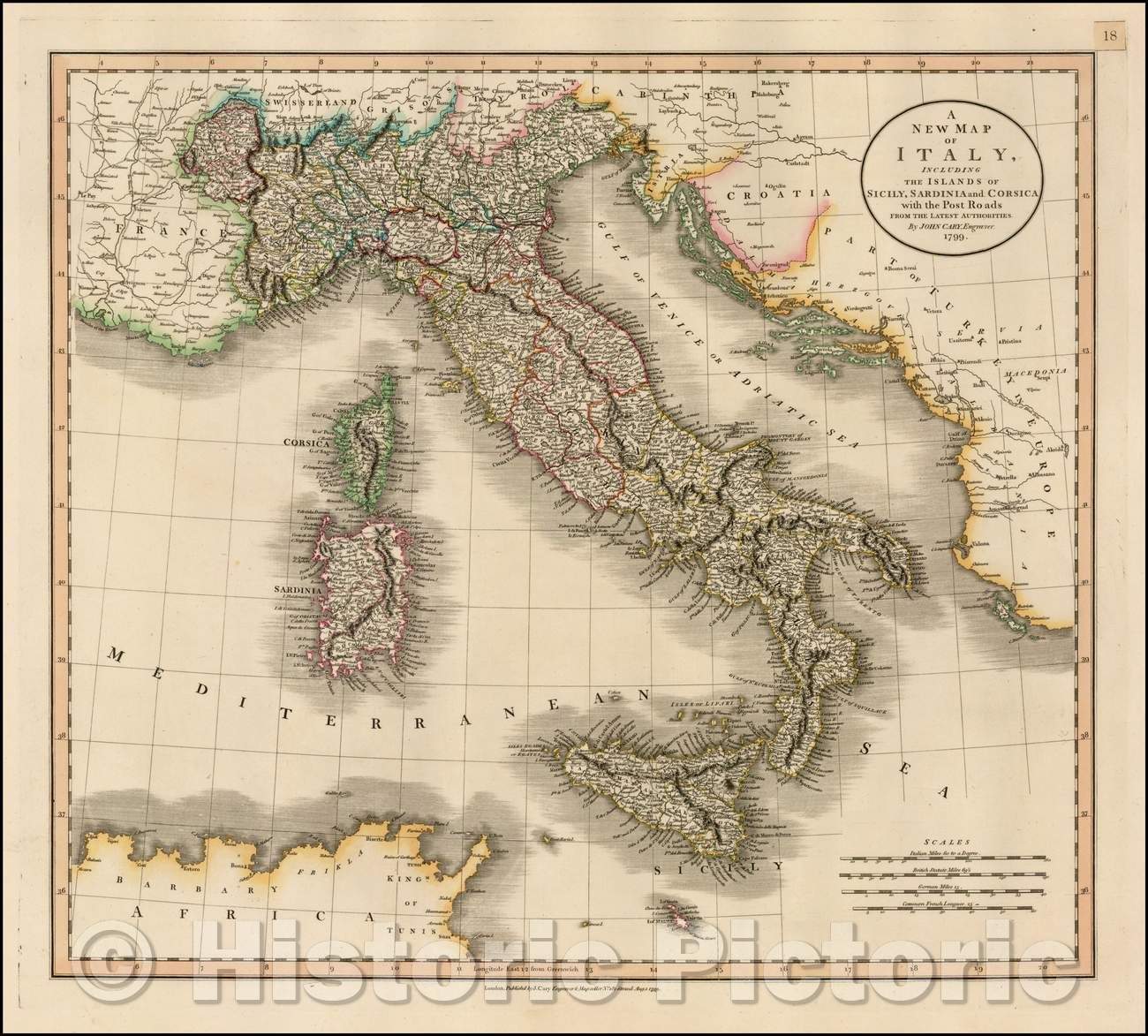 • .Historic Map - Italy, Including The Islands of Sicily, Sardinia and Corsica, with the Post Roads, 1799, John Cary v1