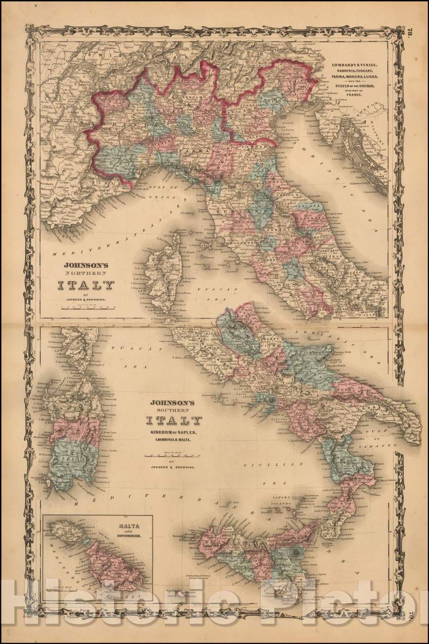 • .Historic Map - Johnson's Northern Italy and Southern Italy Kingdom of Naples, I. Sardinia & Malta [Large inset of Malta], 1859, Benjamin Ward - Vintage Wall Art