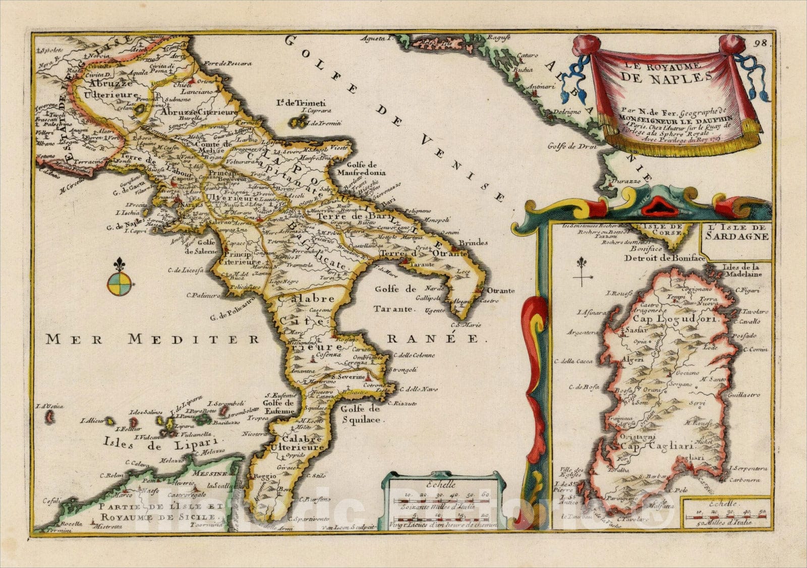 Historic Map : Les Royaume De Naples . . .1705 [Includes Sardinia], 1705, Nicolas de Fer, Vintage Wall Art
