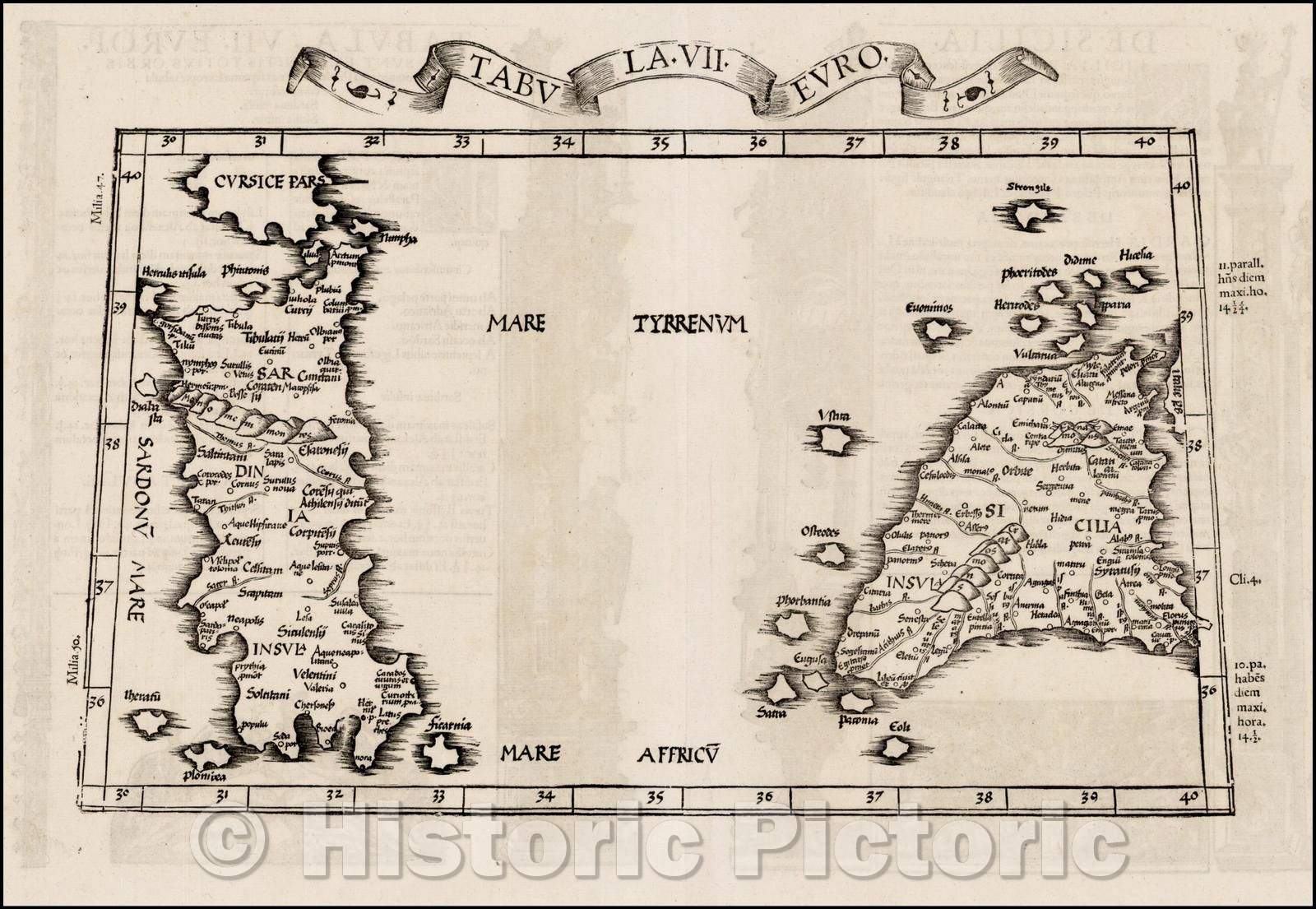 Historic Map - Tabula VII Euro. Sicily and Sardinia, 1535, Lorenz Fries - Vintage Wall Art