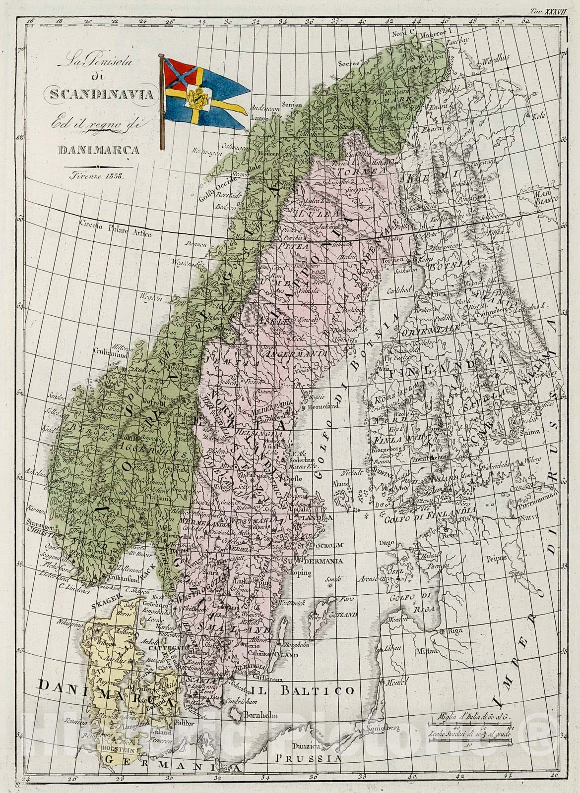 Historic Map : La Penisola di Scandinavia Ed il regno di Danimarca, 1842, Vintage Wall Decor
