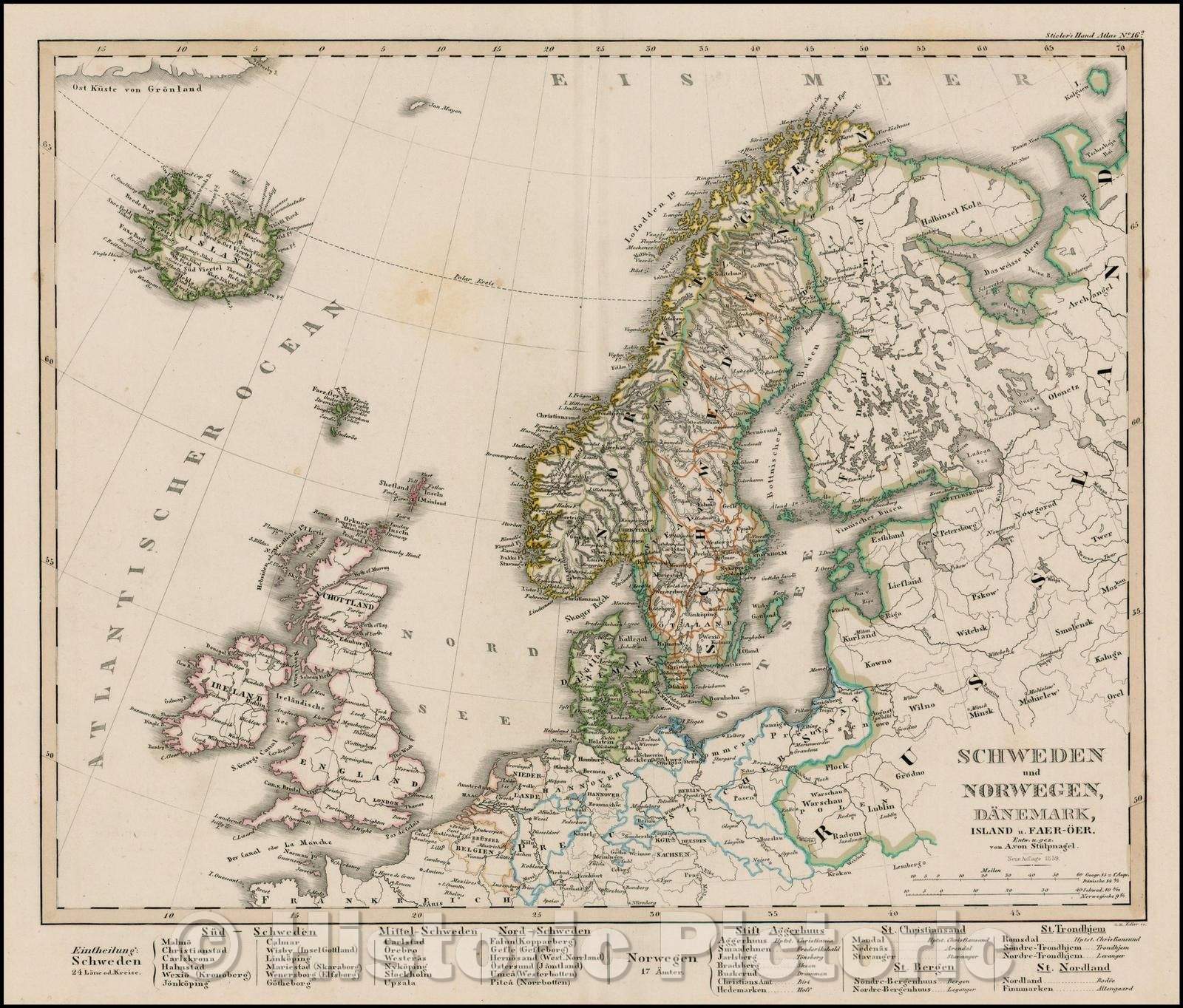 Historic Map - Schweden und Norwegen, Danemark, Island u Faer-Oer/Map of the North Atlantic, centered on Scandinavia, 1859, Adolf Stieler - Vintage Wall Art