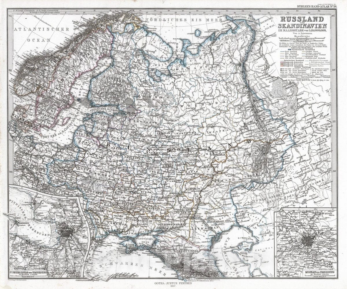 • .Historic Map : Sweden; Norway; Denmark; Russian Federation, Scandinavia 1867 Russland und Skandinavien. (Russia and Scandinavia). , Vintage Wall Art