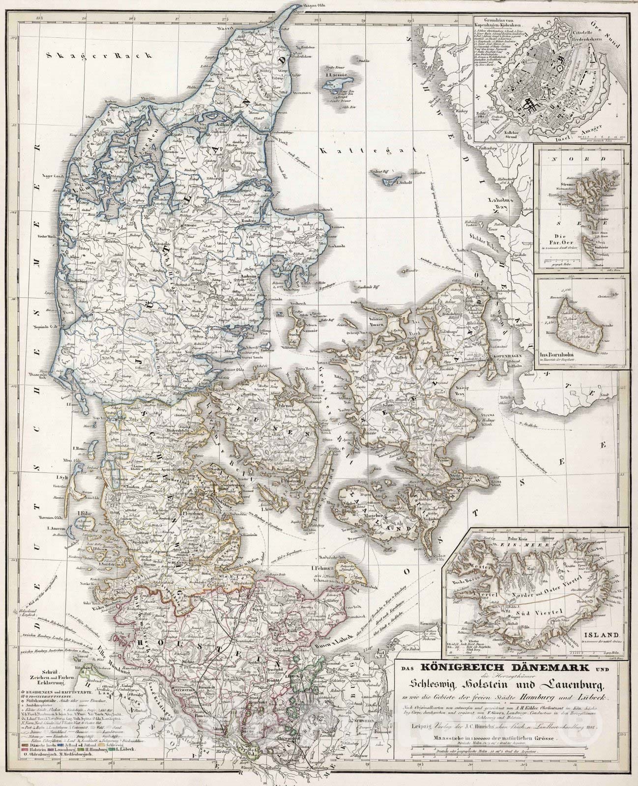 • .Historic Map : Sweden, Scandinavia 1854 Das Konigreich Danemark und die Herzogthumer Schleswig , Vintage Wall Art