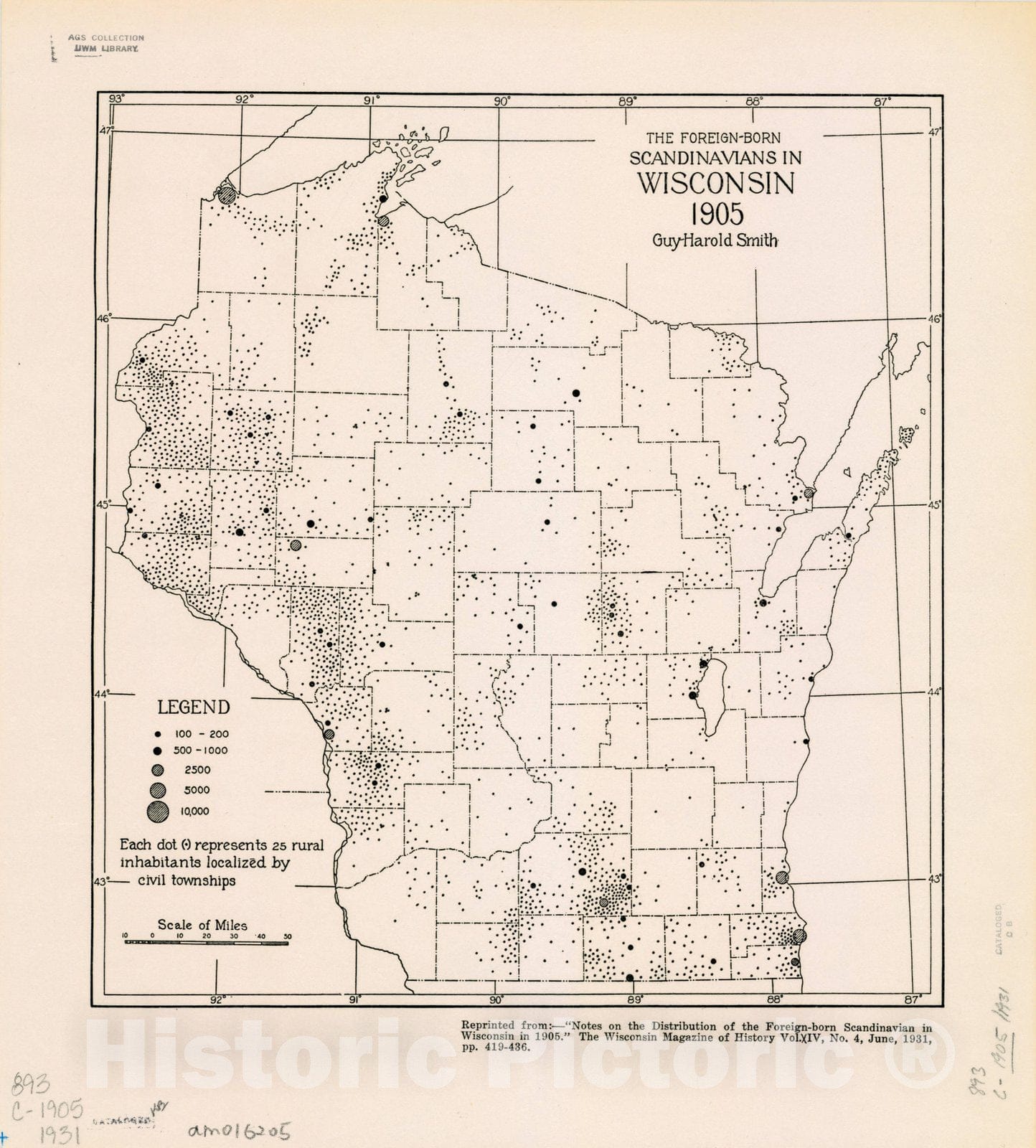Map : Wisconsin 1931, The foreign-born Scandinavians in Wisconsin, 1905 , Antique Vintage Reproduction