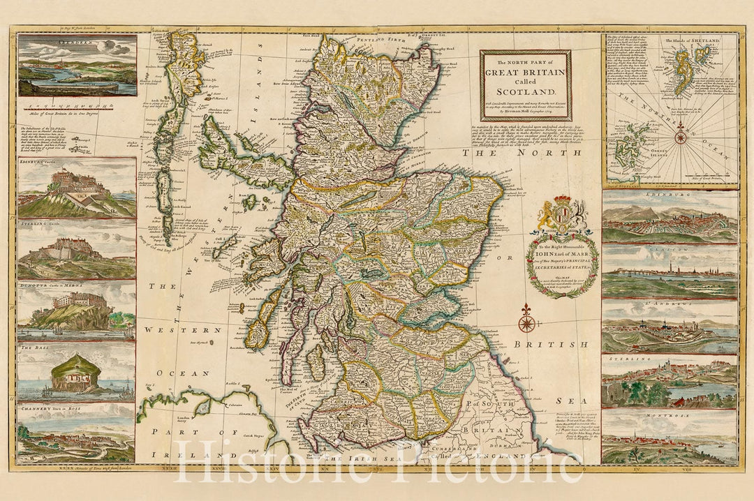 Historic Map - The North Part of Great Britain Called Scotland with Considerable Improvements and many Remarks not Extant in any Map, 1714, Herman Moll - Vintage Wall Art