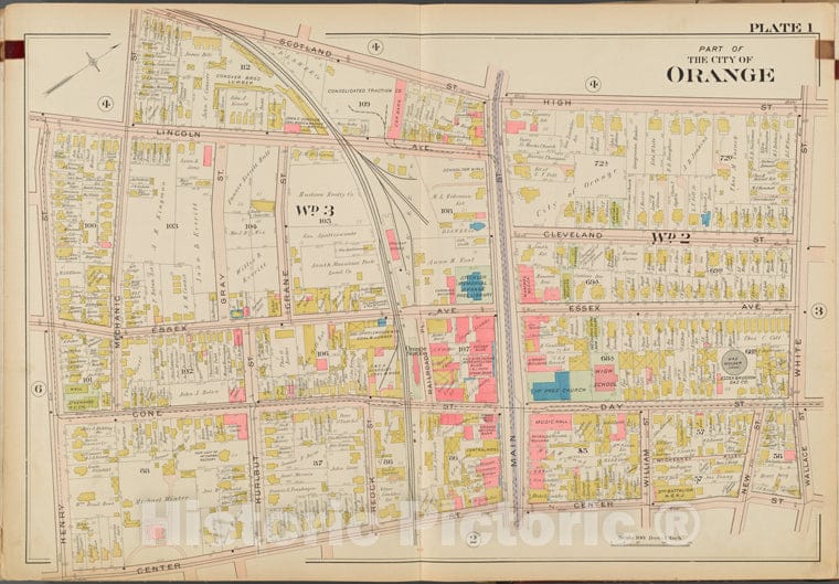 Historic Map - 1904 Essex County, New Jersey (N.J.), Orange. Plate No. 1 Map Scotland St, High St, White St, Wallace St, N. Center St, Center St, Henry St.