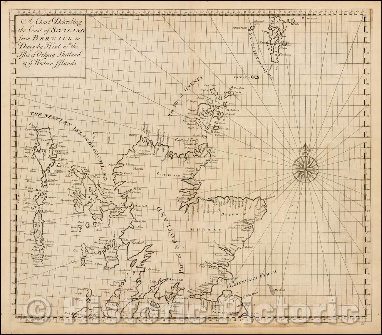Historic Map - A Chart Describing the Coat of Scotland from Berwick to Dungs, 1728, John Senex - Vintage Wall Art