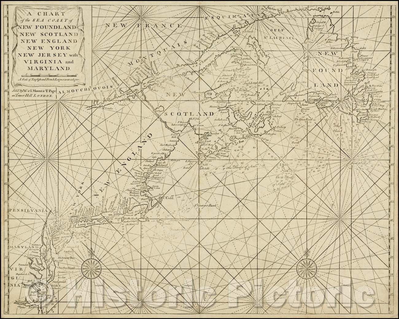 Historic Map - A Chart of the Sea Coast of New Foundland New Scotland New England New York New Jersey with Virginia and Maryland, 1750, William Mount - Vintage Wall Art