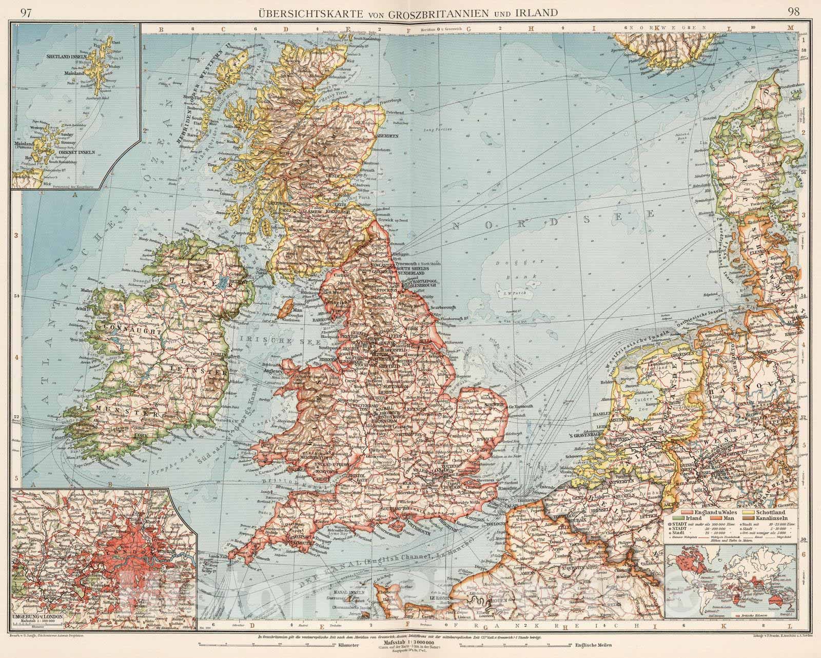 Historic Map : England; Ireland; Scotland, Great Britain 1905 Ubersichtskarte von Groszbritannien und Irland , Vintage Wall Art