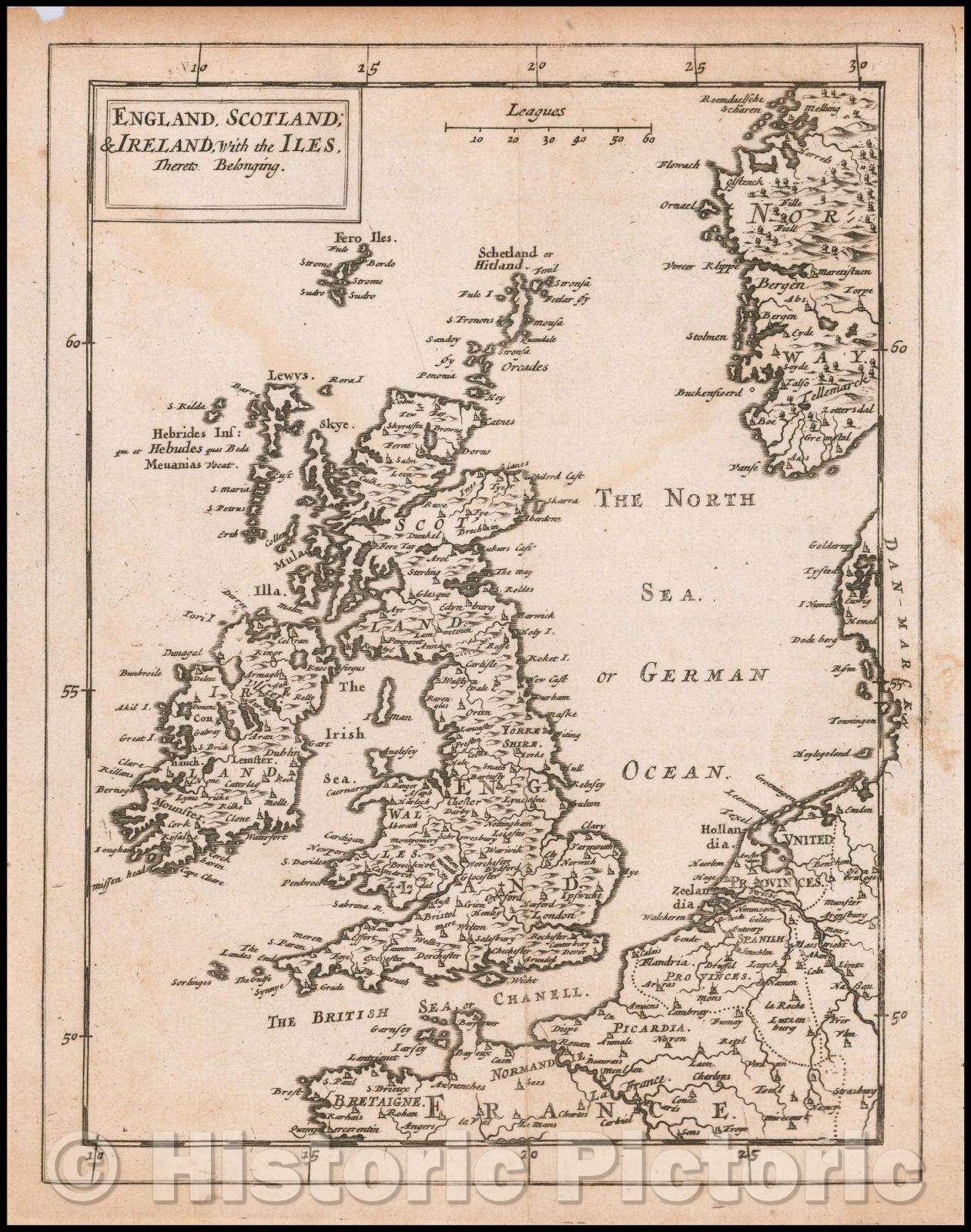 • .Historic Map - England, Scotland, Ireland, With the Iles Thereto Belonging, 1681, Sir Jonas Moore - Vintage Wall Art