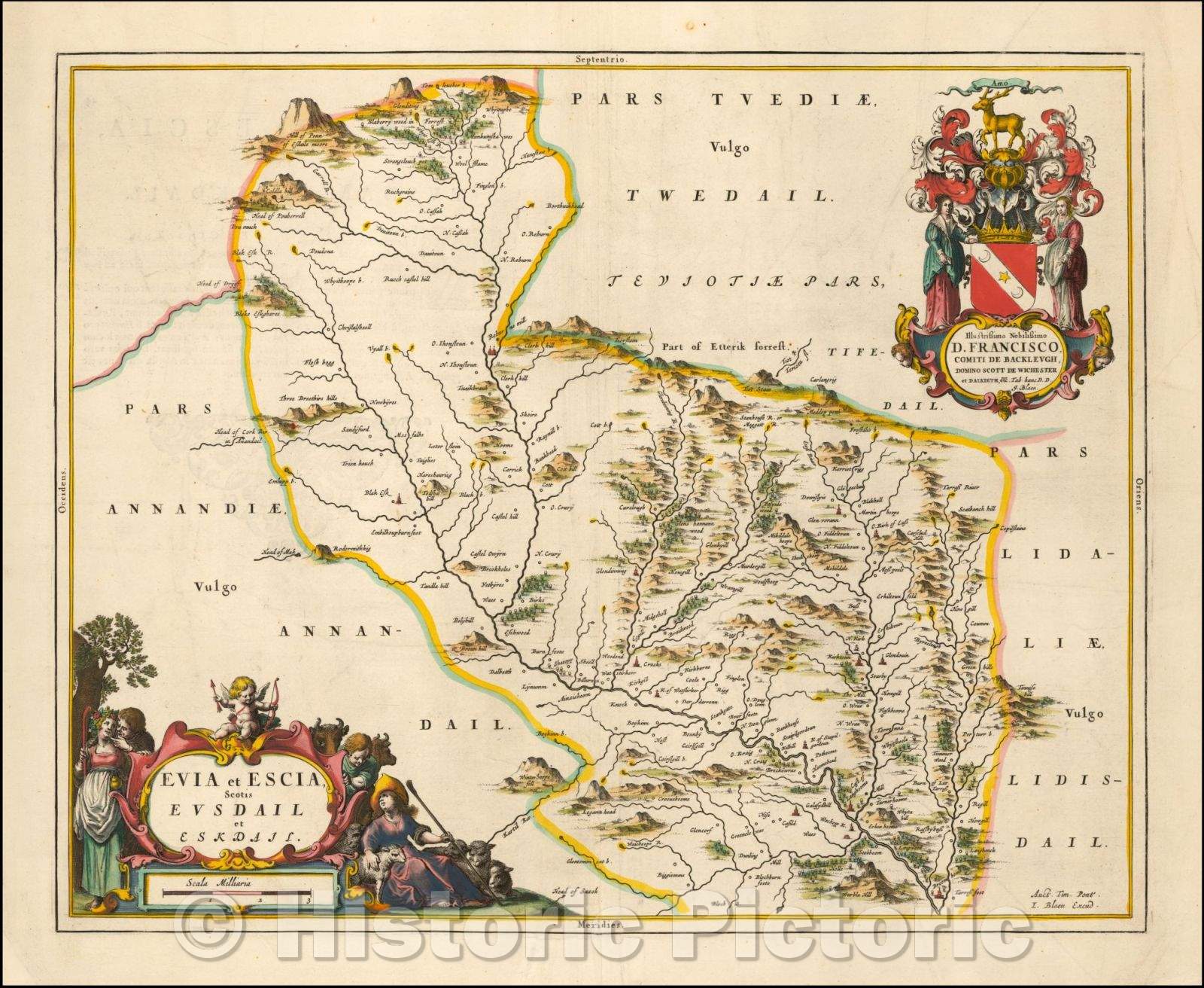 Historic Map - Evia et, Scotis Evsdail et Eskdail/Regional Map of Scotland, centered on the River Esk in the Southern UPlands, 1654, Willem Janszoon Blaeu - Vintage Wall Art