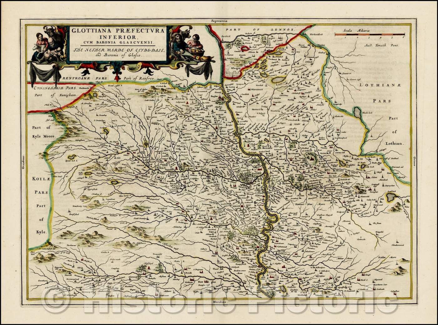Historic Map - Glottiana Praefectura Inferior, cum Baronia Glascuensi/Regional Map of Scotland, from Blaeu's Atlas Maior, 1654, Willem Janszoon Blaeu - Vintage Wall Art