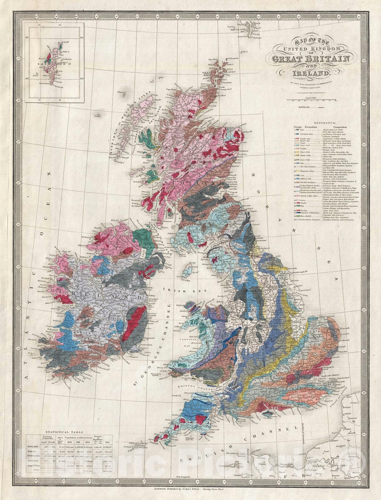 • .Historic Map : Great Britian "England, Ireland, Scotland", Wyld Geological, 1849, Vintage Wall Art