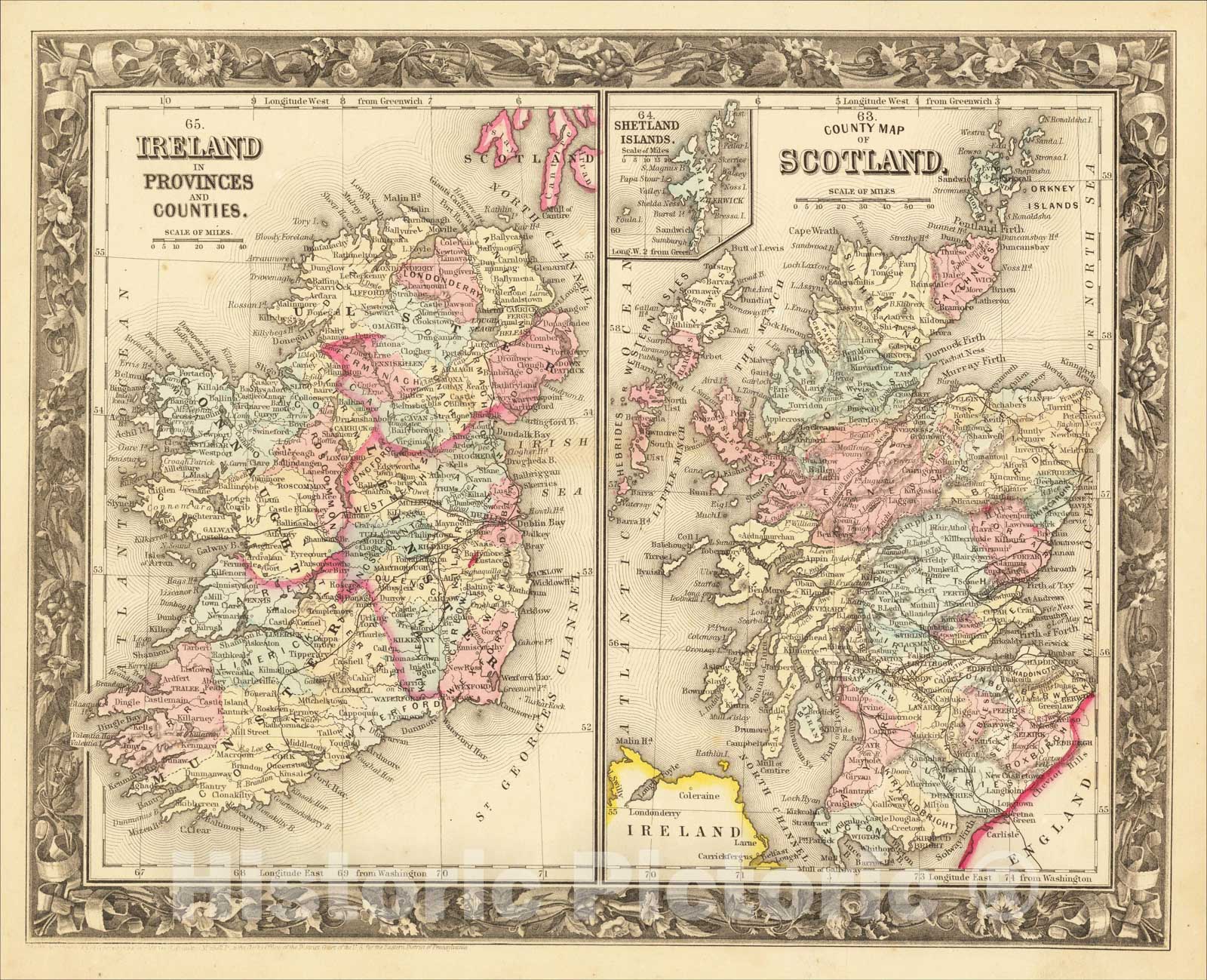 Historic Map : Ireland in Provinces and Counties with County Map of Scotland, 1861, Samuel Augustus Mitchell Jr., Vintage Wall Art