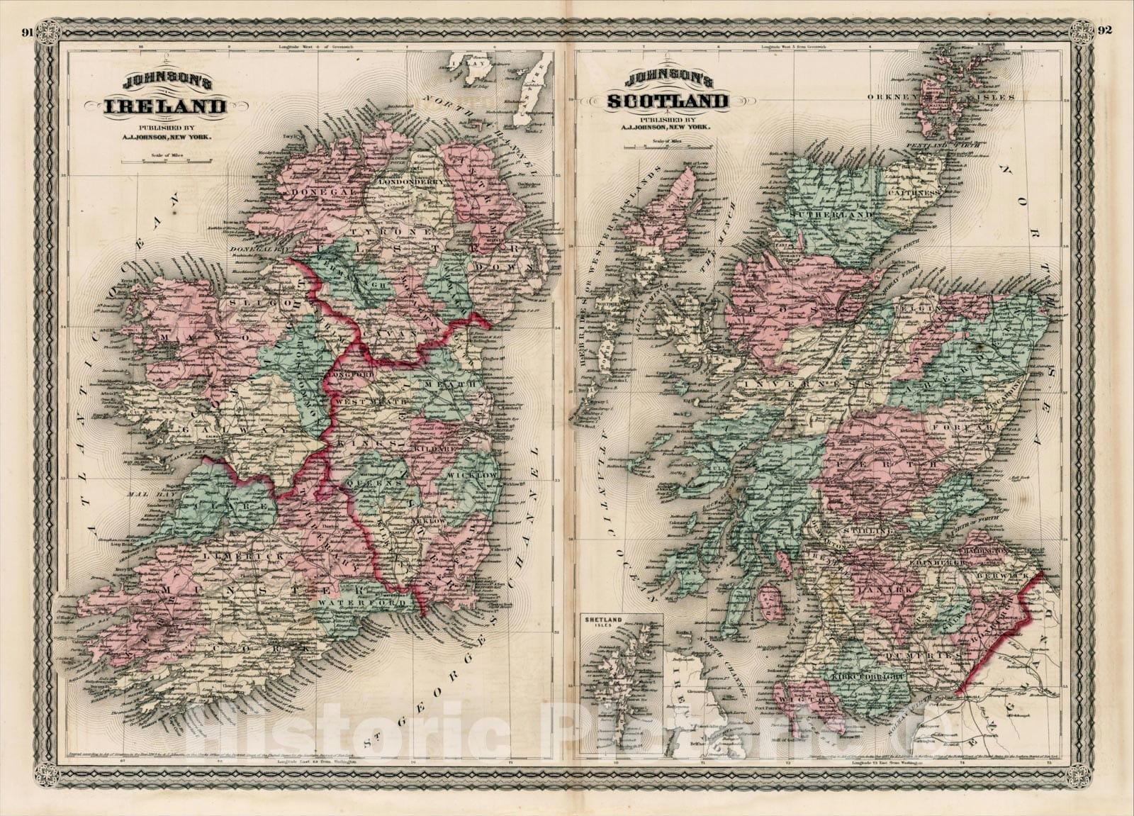 • .Historic Map : Johnson's Ireland with Johnson's Scotland, 1875, Alvin Jewett Johnson, Vintage Wall Art