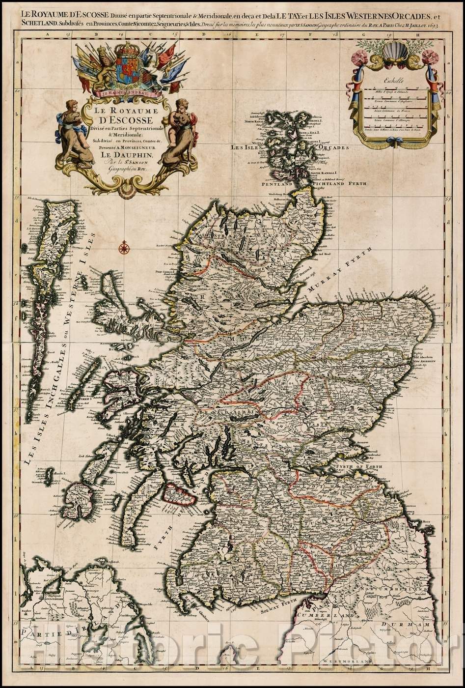 Historic Map - Le Royaume D'Ecosse Divise en Parties Septentrionales & Meridionales :: Format of Scotland, colored by counties, published by Hubert Jaillot, 1693 - Vintage Wall Art