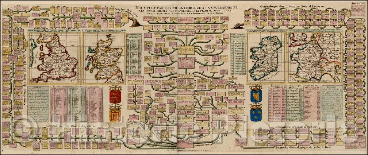 Historic Map - Nouvelle Carte Pour La Geographie et a la Genealogie Des Rois D'Angleterre et D'Ecosse Maps of Ireland, England, Scotland, France, 1719 - Vintage Wall Art