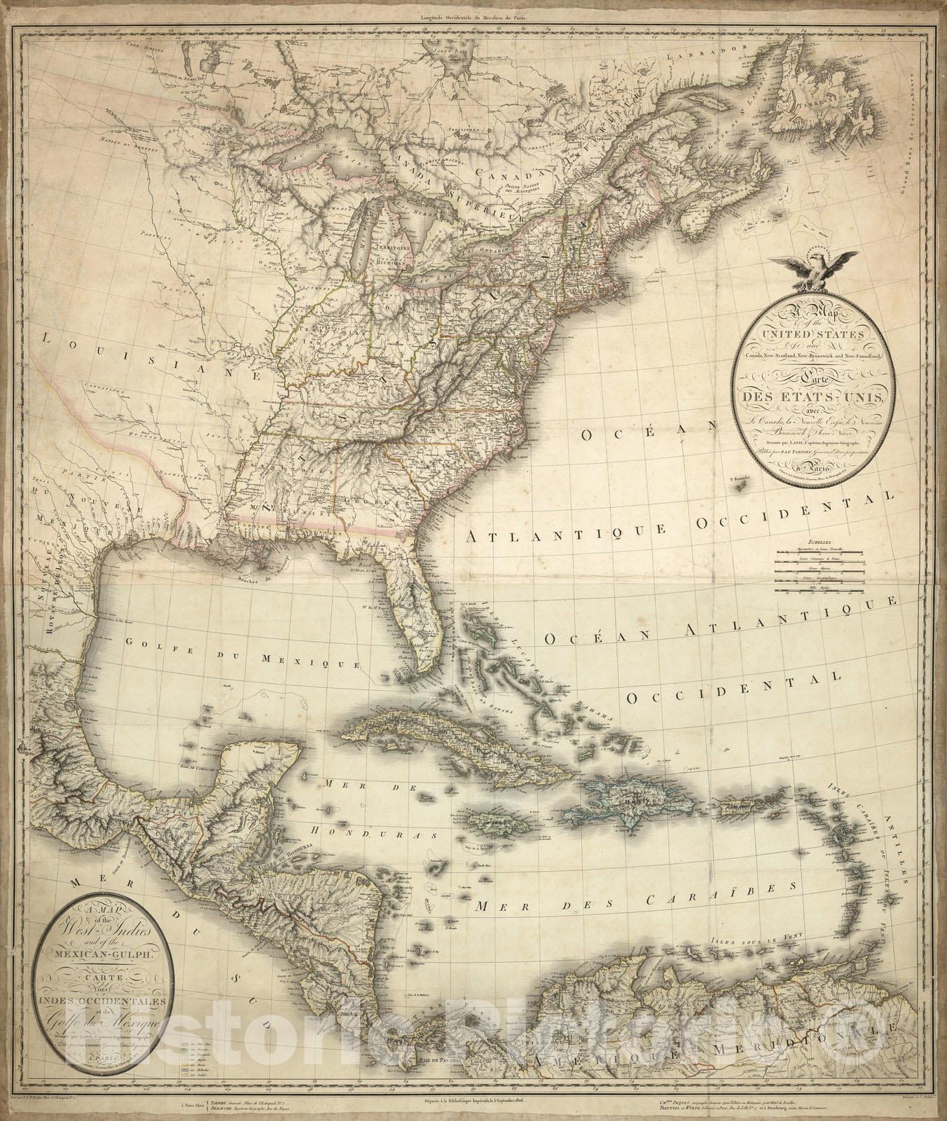 A Map of the United States, Canada, New-Scotland, New-Brunswick and New-Foundland ... Carte Des Etats - Unis, Avec Le Canada, la Nouvelle Ecosse, le Nouveau Brunswick & Terre - Neuve. A Map of the West-Indies and the Mexican Gulph (Gulf) ...Carte Des Indes Occientale et du Golfe du Mexique... Dressee par Lapie, Capitaine-Ingenieur-Geographe. Publiee par P.A.F. Tardieu, Gravveur, Editeur-proprietaire, a Paris, Chez P.A.F. Tardieu .... | A Map of the United States, Canada, New-Scotland, New-Brunswick and New-Foundland ... Carte Des Etats - Unis, Avec Le Canada, la Nouvelle Ecosse, le Nouveau Brunswick & Terre - Neuve. A Map of the West-Indies and the Mexican Gulph (Gulf) ...Carte Des Indes Occientale et du Golfe du Mexique... Dressee par Lapie, Capitaine-Ingenieur-Geographe. Publiee par P.A.F. Tardieu, Gravveur, Editeur-proprietaire, a Paris, Chez P.A.F. Tardieu ..... | Mounted on linen. In English and French. Consists of two sheets with separate titles but mounted together (a purposeful option). Relief shown by sketches.