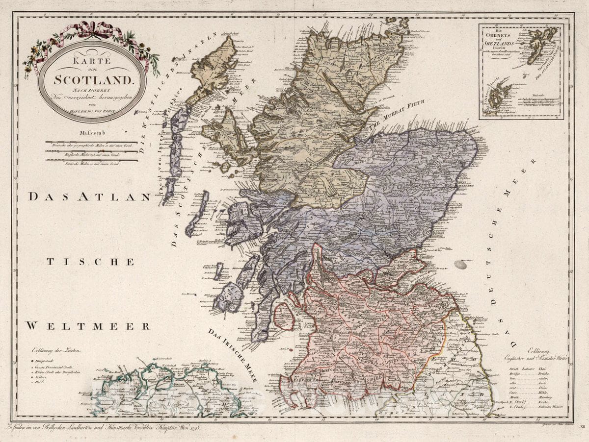 Historic Wall Map : Scotland, Karte von Scotland. Nach Dorret. Neu verzeichnet herausgegeben von Franz Joh. Jos. Von Reilly, 1795 Atlas , Vintage Wall Art