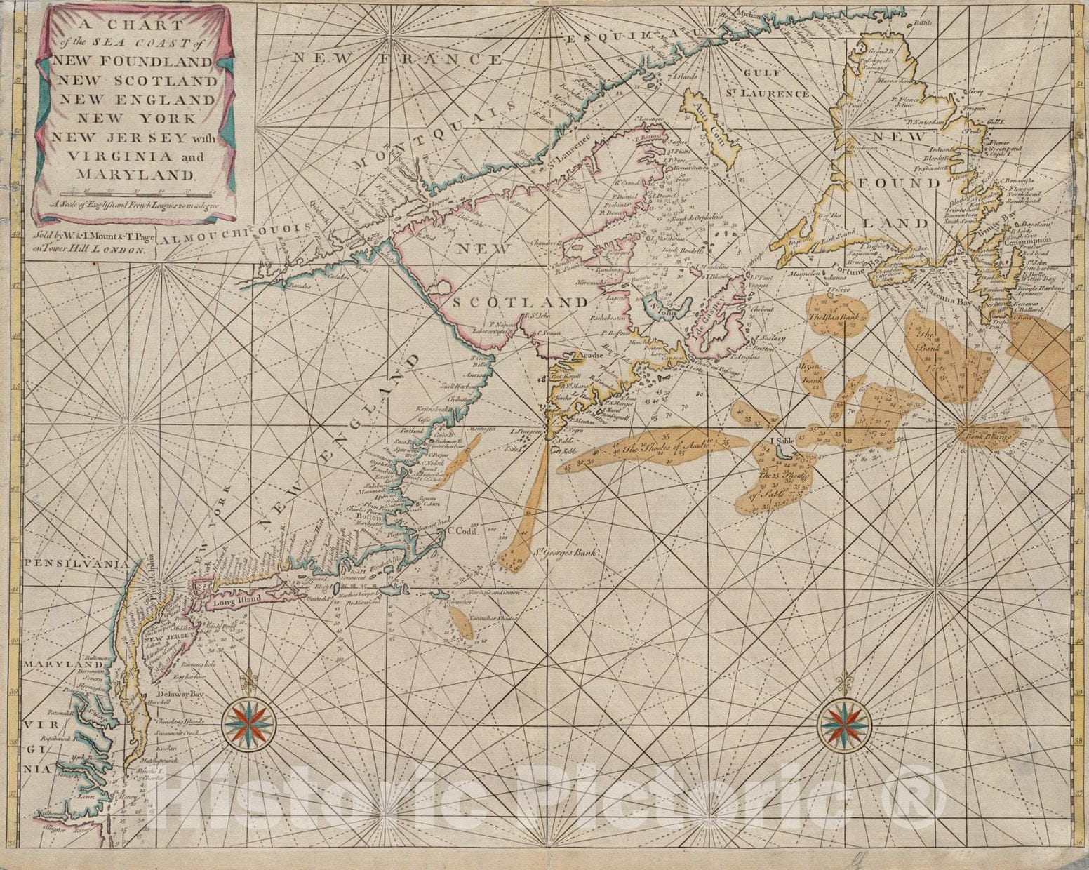 Historical Map, 1713 A Chart of The sea Coast of New Foundland, New Scotland, New England, New York, New Jersey, with Virginia and Maryland, Vintage Wall Art