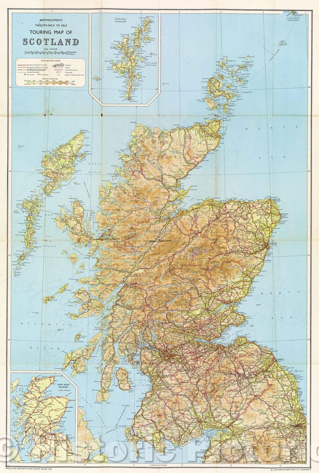 • .Historic Map : Bartholomew's Twelfth-Inch to Mile Touring Map of Scotland, 1960 , Vintage Wall Art