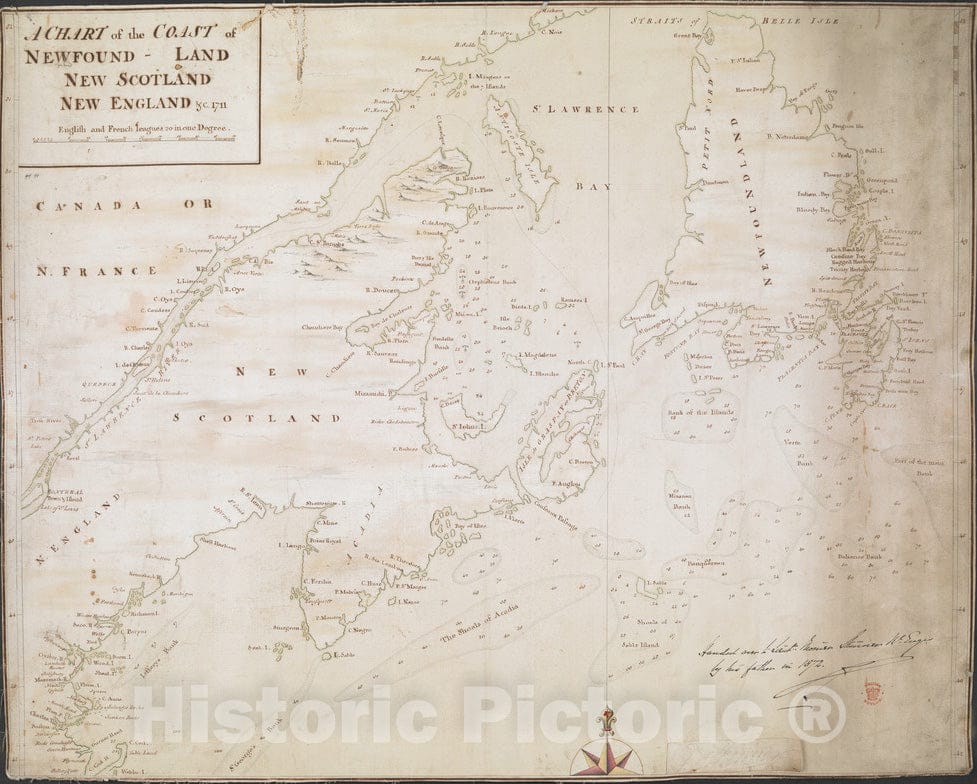 Historical Map, A CHART of the COAST OF NEWFOUND-LAND NEW SCOTLAND NEW ENGLAND et cetera. 1711, Vintage Wall Art