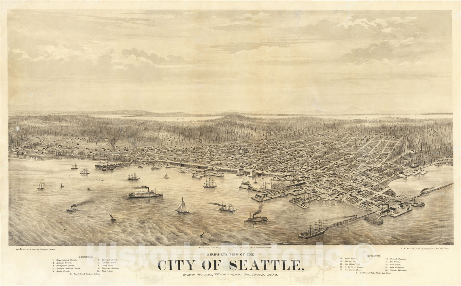 Historic Map : Bird's-Eye View Of The City of Seattle, Puget Sound, Washington Territory, 1878, 1878, Eli Sheldon Glover, v2, Vintage Wall Art