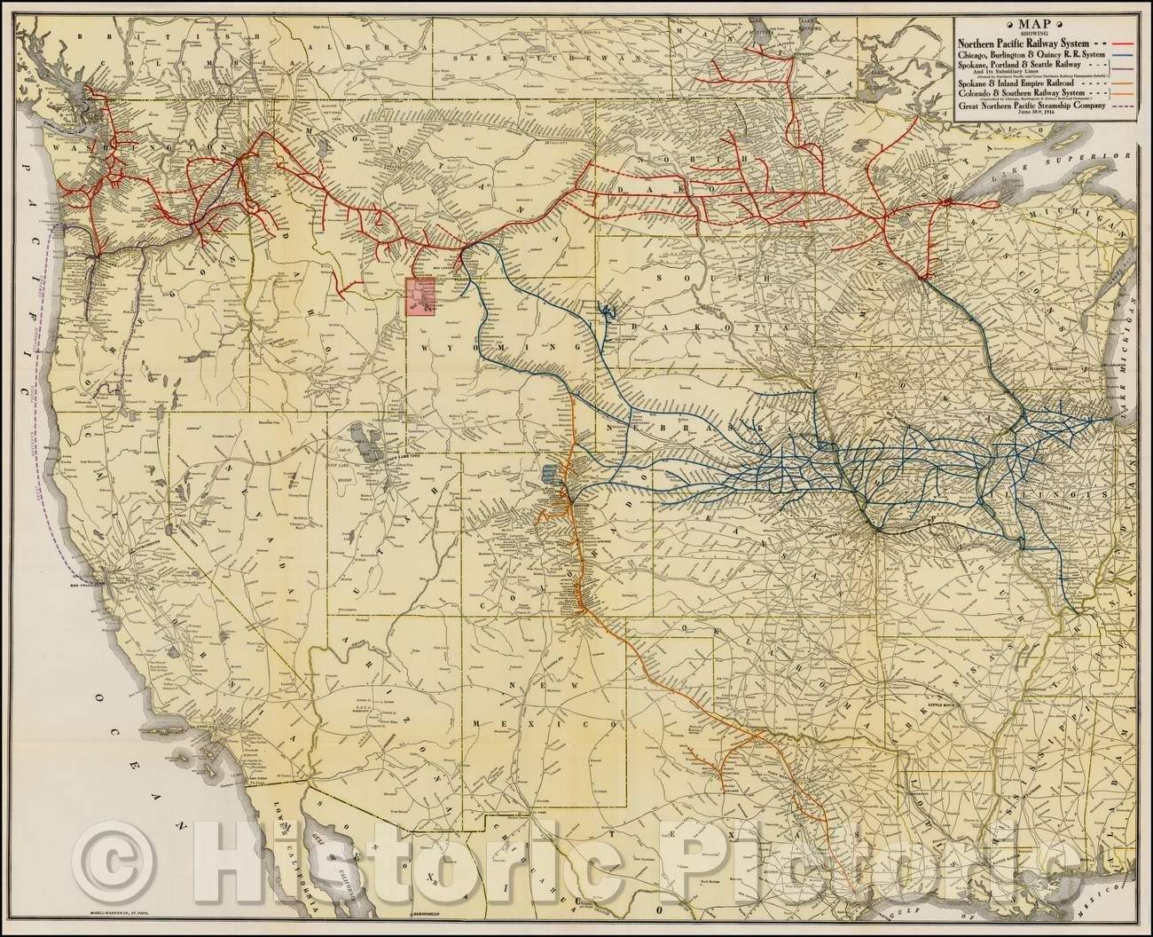 Historic Map - Map Showing Northern Railway System/Chicago, Burlington & Qunicy R.R. System/Spokane, Portland & Seattle Railway, 1916, McGill-Warner Co. - Vintage Wall Art