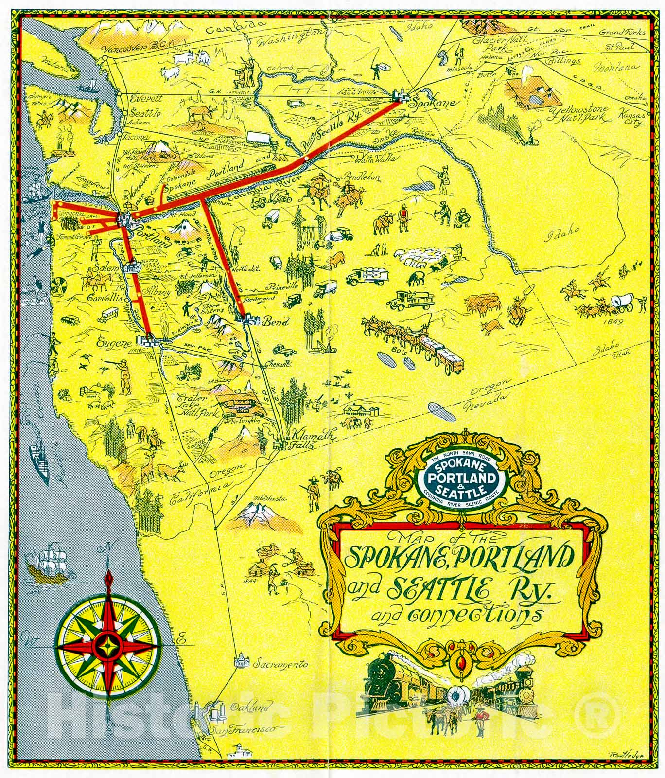 • .Historic Map : Map of the Spokane, Portland and Seattle Ry. and Connections., 1917, Vintage Wall Decor