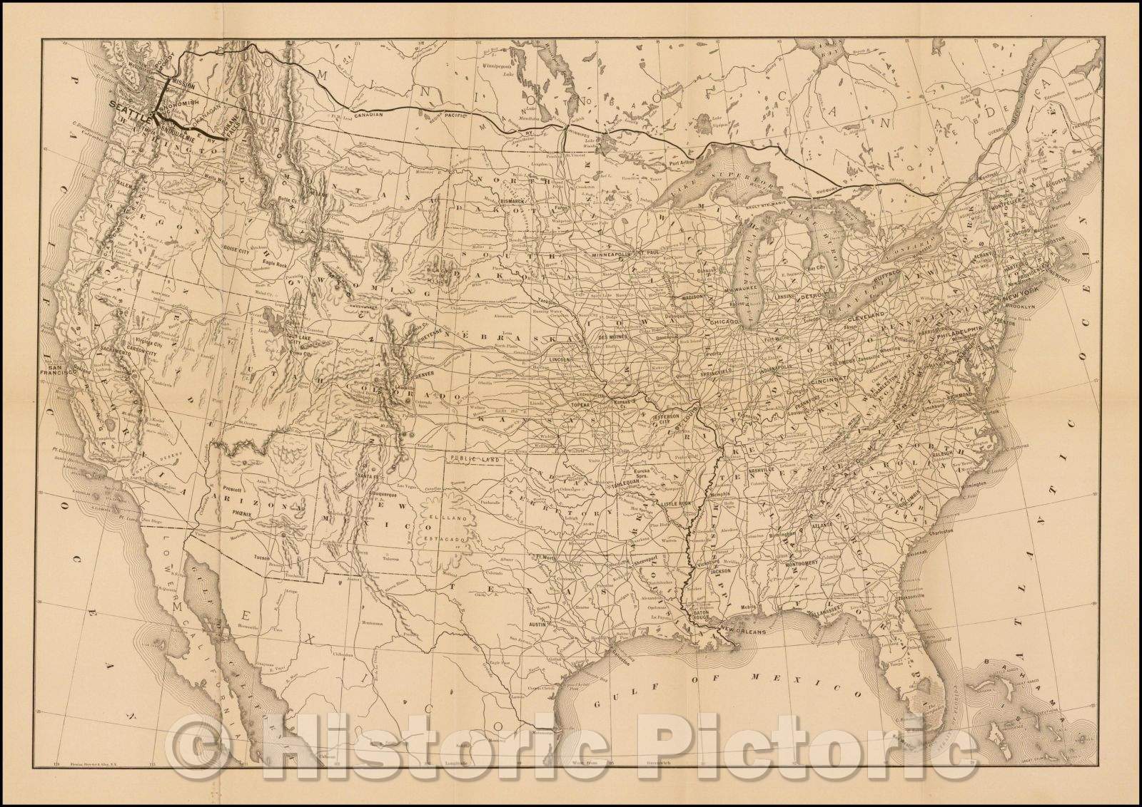 • .Historic Map - Map of United States, Showing Routes of Seattle, Lake Shore & Eastern Railway and Canadian Pacific Railway, 1888, Flemming, Brewster & Alley - Vintage Wall Art