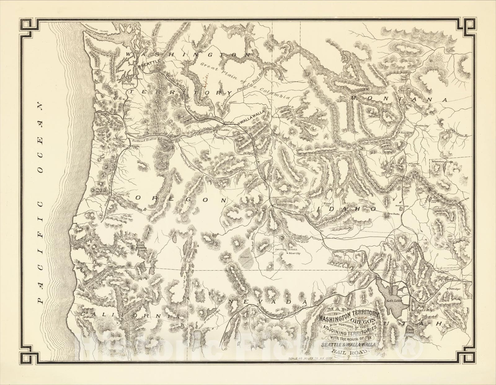 • Historic Map : Map of Washington Territory and Oregon with portions of adjoining Territories with the Route of the Seattle & Walla Walla Rail Road, 1875, v1, Vintage Wall Art