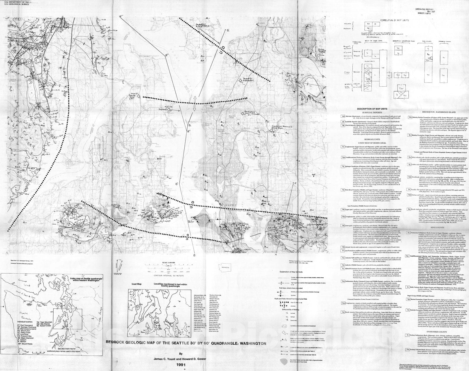 Map : Bedrock geologic map of the Seattle 30' by 60' quadrangle, Washington, 1991 Cartography Wall Art :