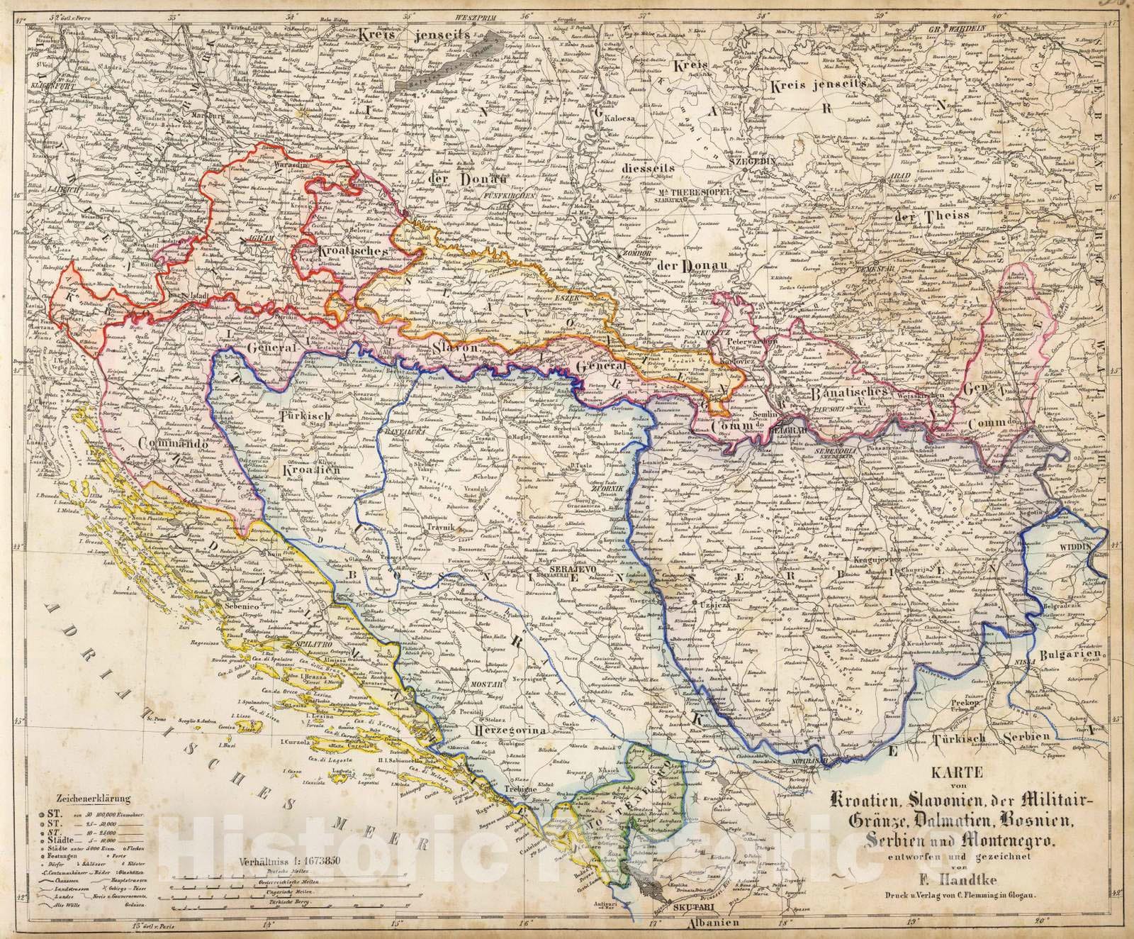 Historic Map : Bosnia and Hercegovina; Serbia, Balkan Peninsula 1855 Kroatien, Slavonien, Militair-Granze, Dalmatien, Bosnien, Serbien, Montenegro., Vintage Wall Art