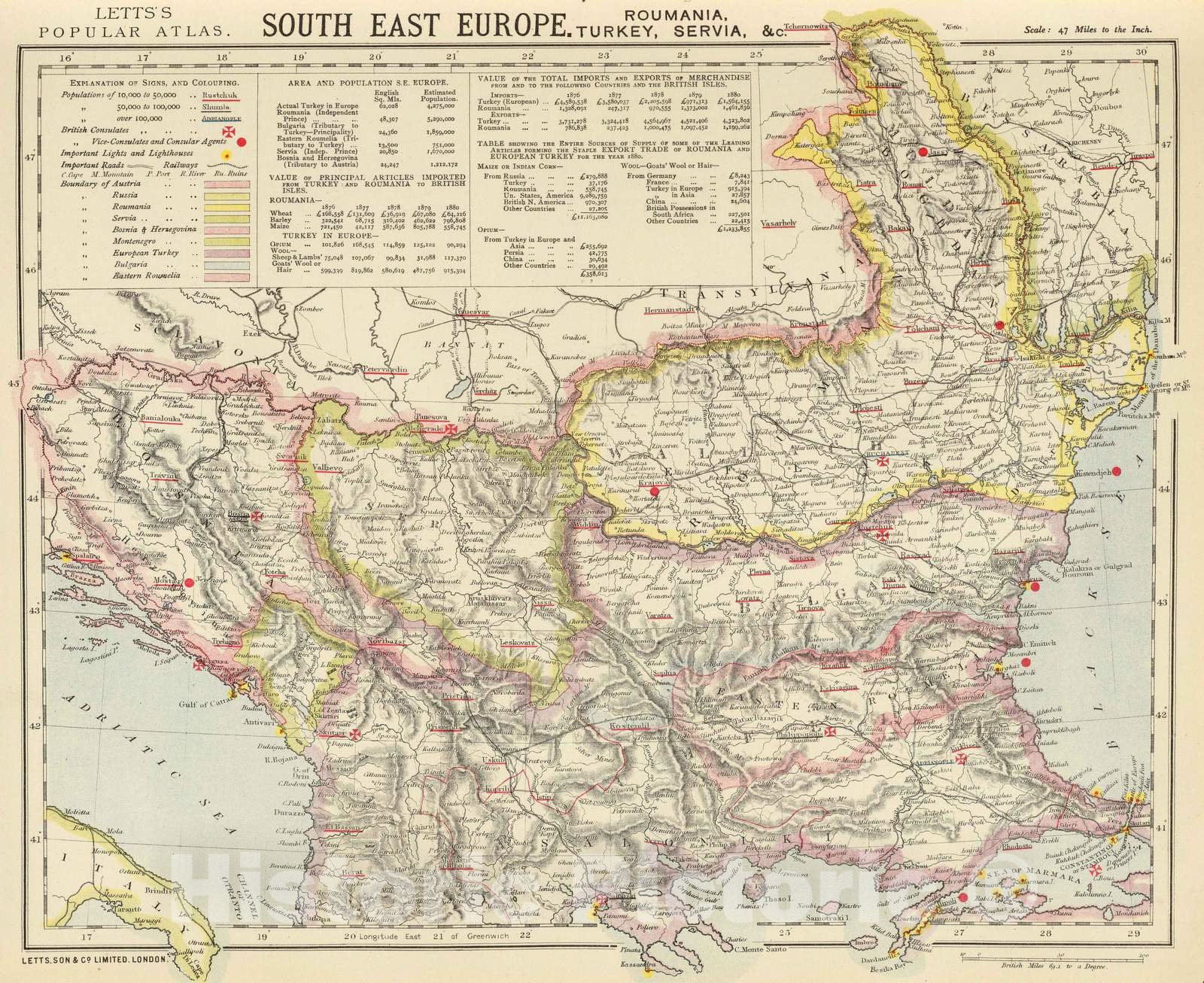 Historic Map : Romania; Serbia, Balkan Peninsula 1883 S.E. East Europe, Roumania, Turkey, Servia. , Vintage Wall Art