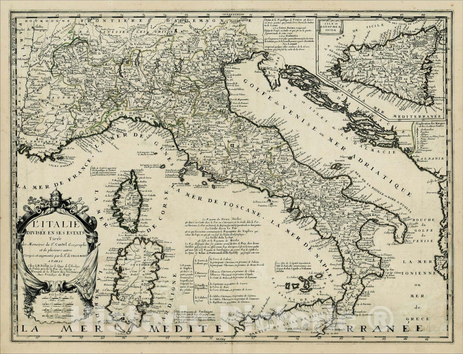 Historic Map : L'Italie Divisee en ses estats Tiree, des Memoires du Sr. Cantel, (Sicily Inset), c1700, v2, Vintage Wall Art