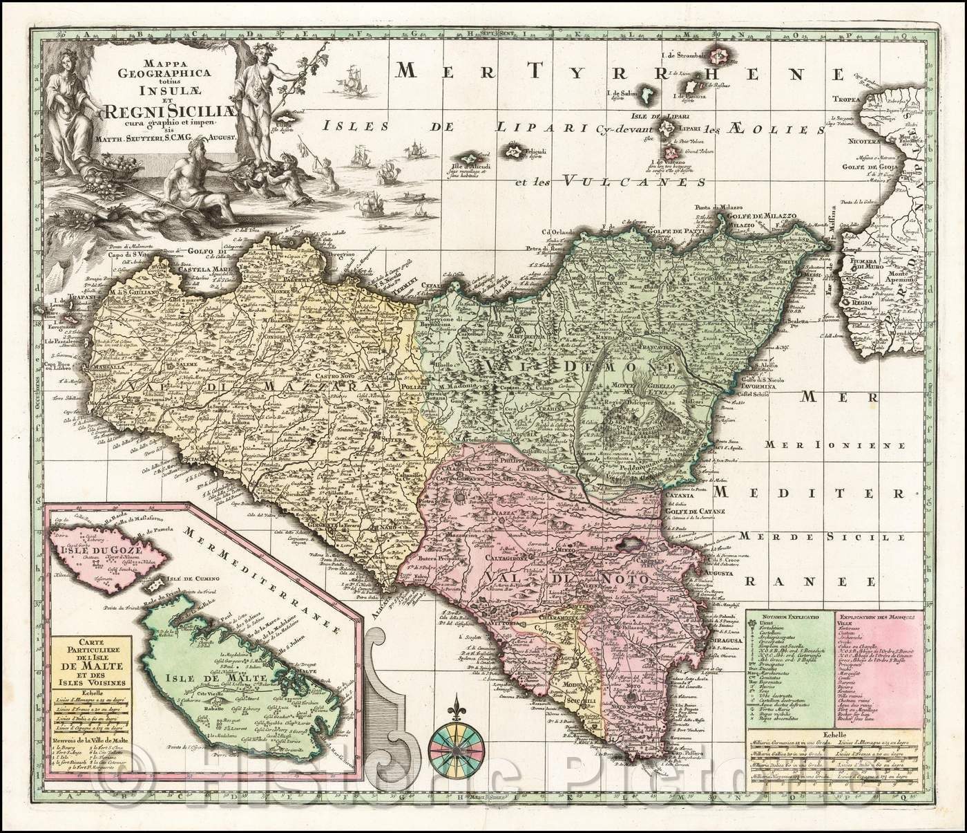 Historic Map - Mappa Geographica totius Insulae et Regni Siciliae cura graphio et impensi :: Kingdom of Sicily, 1730 - Vintage Wall Art