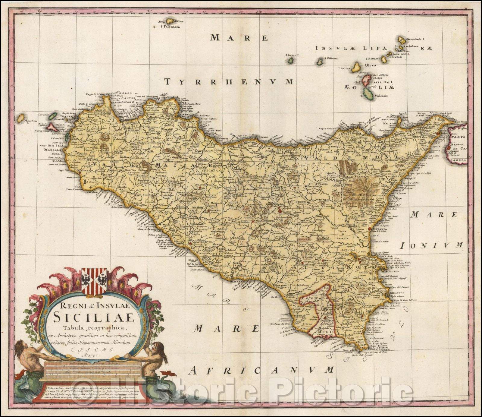 Historic Map - Regni & Insulae Siciliae Tabula geographica, ex Archetypo/Map of Sicily, published in Nuremberg by the heirs of J.B. Homann, 1747 - Vintage Wall Art