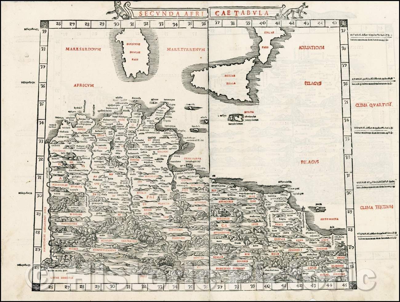 • .Historic Map - Secunda Africae Tabula/Sylvanus' Map of part of Tunisia, Lybia, Sicily and Sardinia is one of the earliest obtainable Maps of the Region, 1511 - Vintage Wall Art