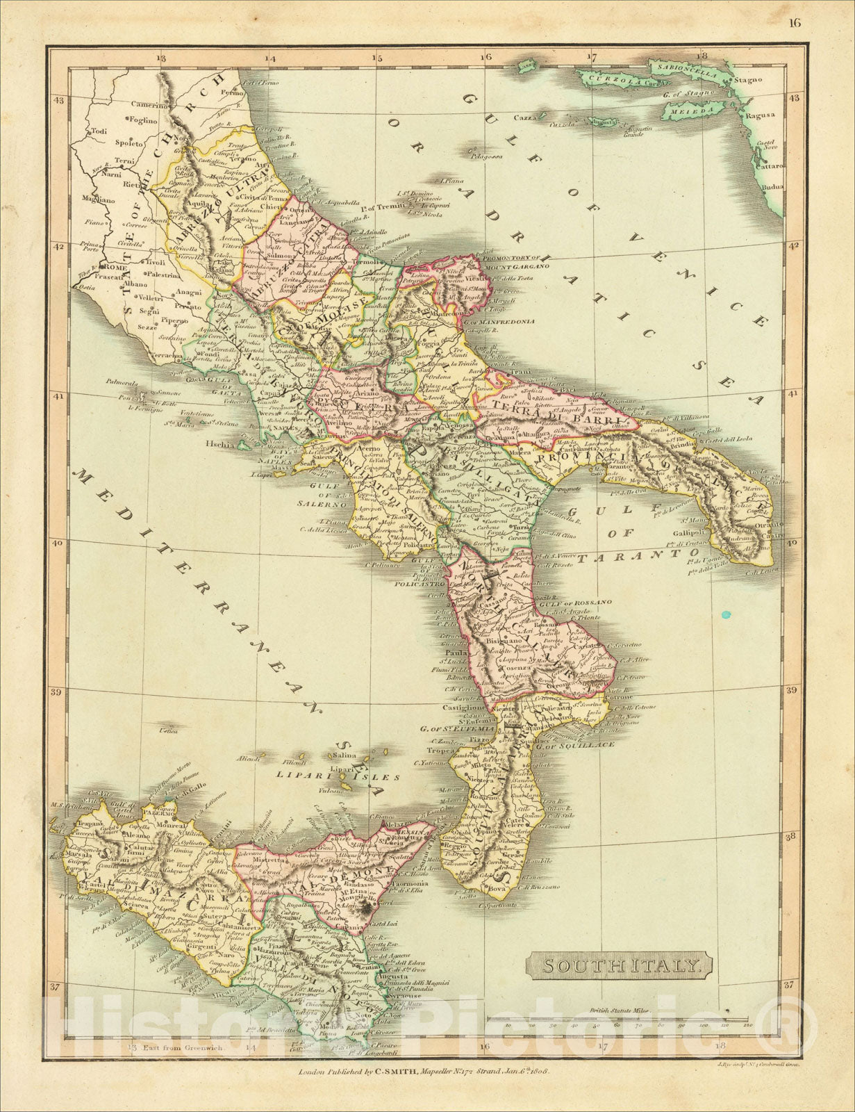 Historic Map : South Italy [Large Sicily], 1809, Charles Smith, Vintage Wall Art