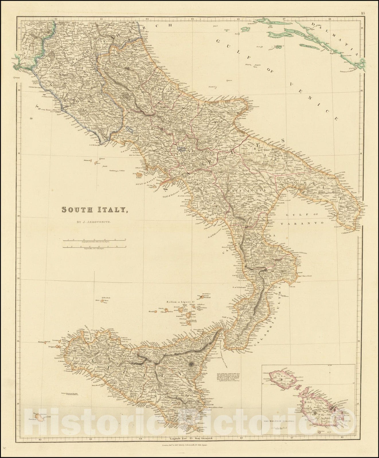 Historic Map : South Italy , with Sicily and Large Malta Inset, 1842, Vintage Wall Art