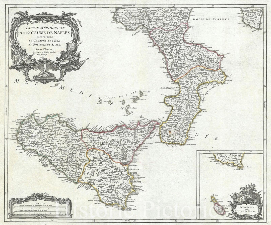 Historic Map : Southern Naples and Sicily, Italy, Vaugondy, 1750, Vintage Wall Art