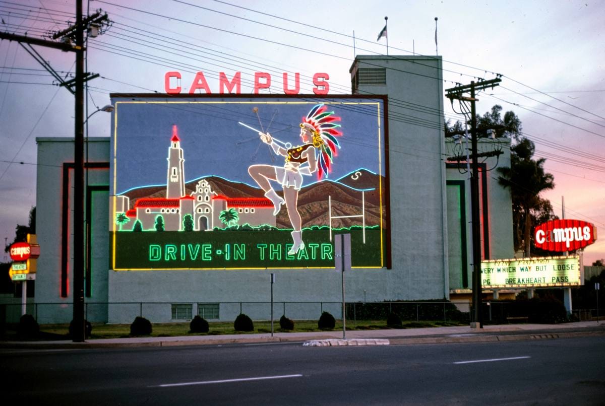 • Historic Photo : 1979 Campus Drive-In Theater, closer view with neon, El Cajon Boulevard, San Diego, California | Photo by: John Margolies |