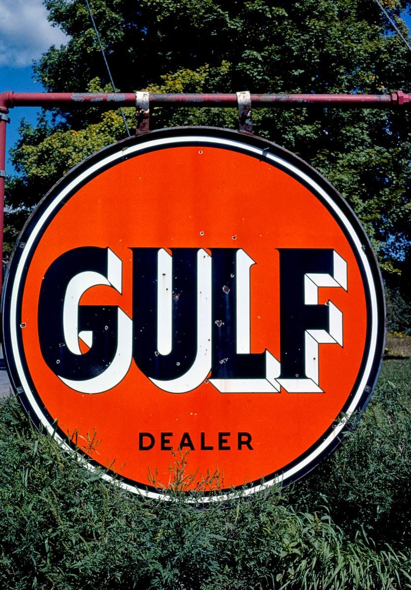 • .Historic Photo : 1976 Gulf Gas sign, close view, Round Top, New York | Margolies | Roadside America Collection | Vintage Wall Art :