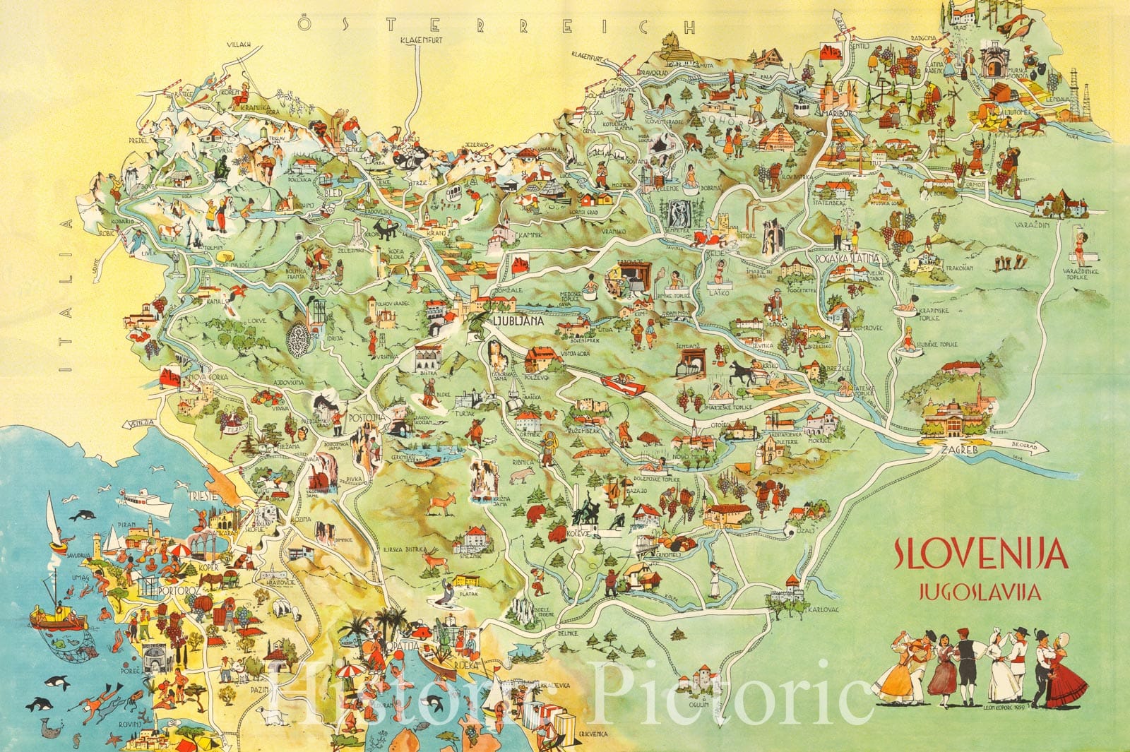 Historic Map - Slovenia, Jugoslavia/Pictorial Map of Slovenia, published by the Slovenian Tourist Bureau, 1959, Leon Koporc - Vintage Wall Art