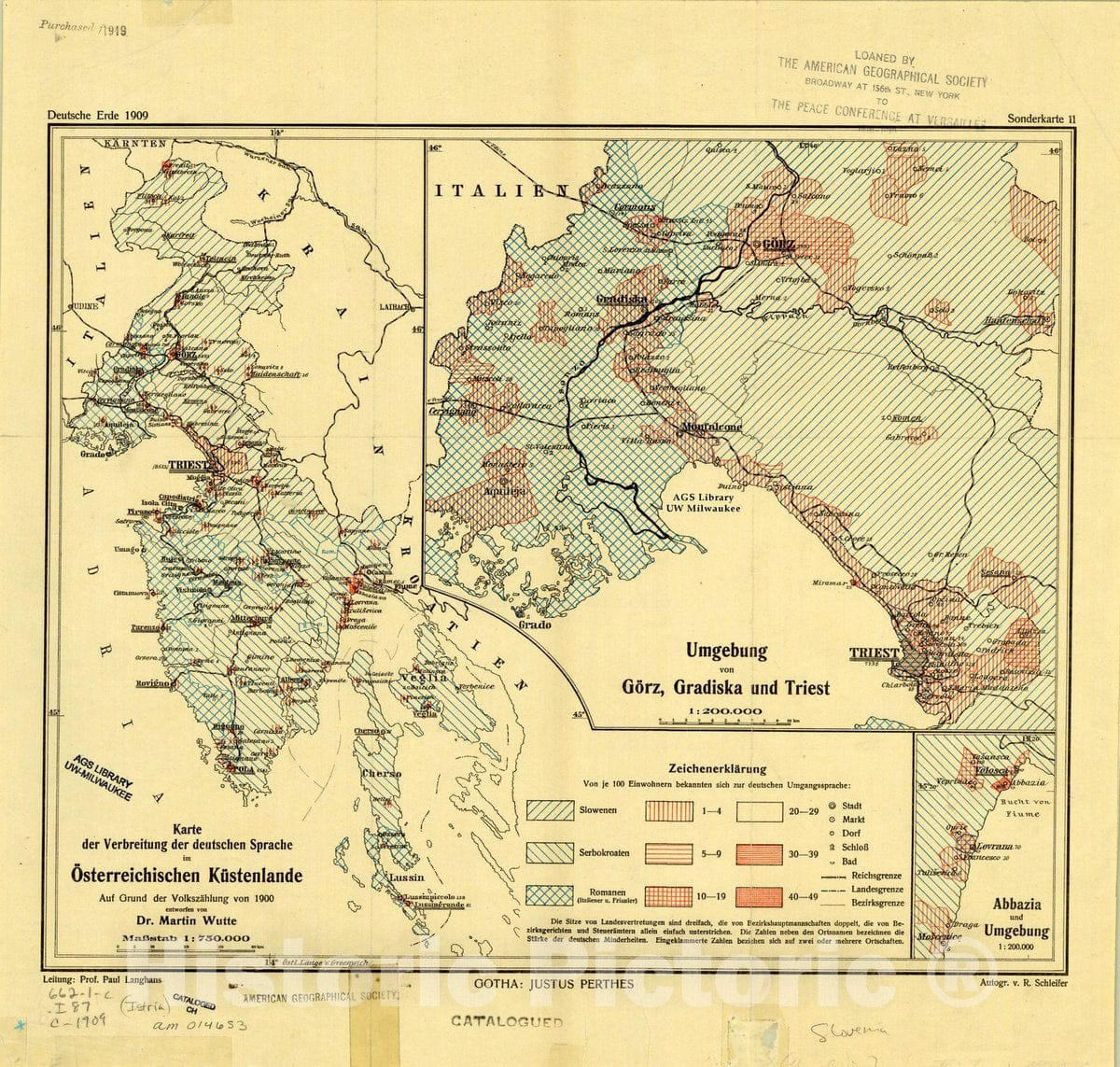 Map : Slovenia 1909, Karte der Verbreitung der deutschen Sprache im Osterreichischen Kustenlande auf Grund der VolkszA?hlung von 1900 , Antique Vintage Reproduction