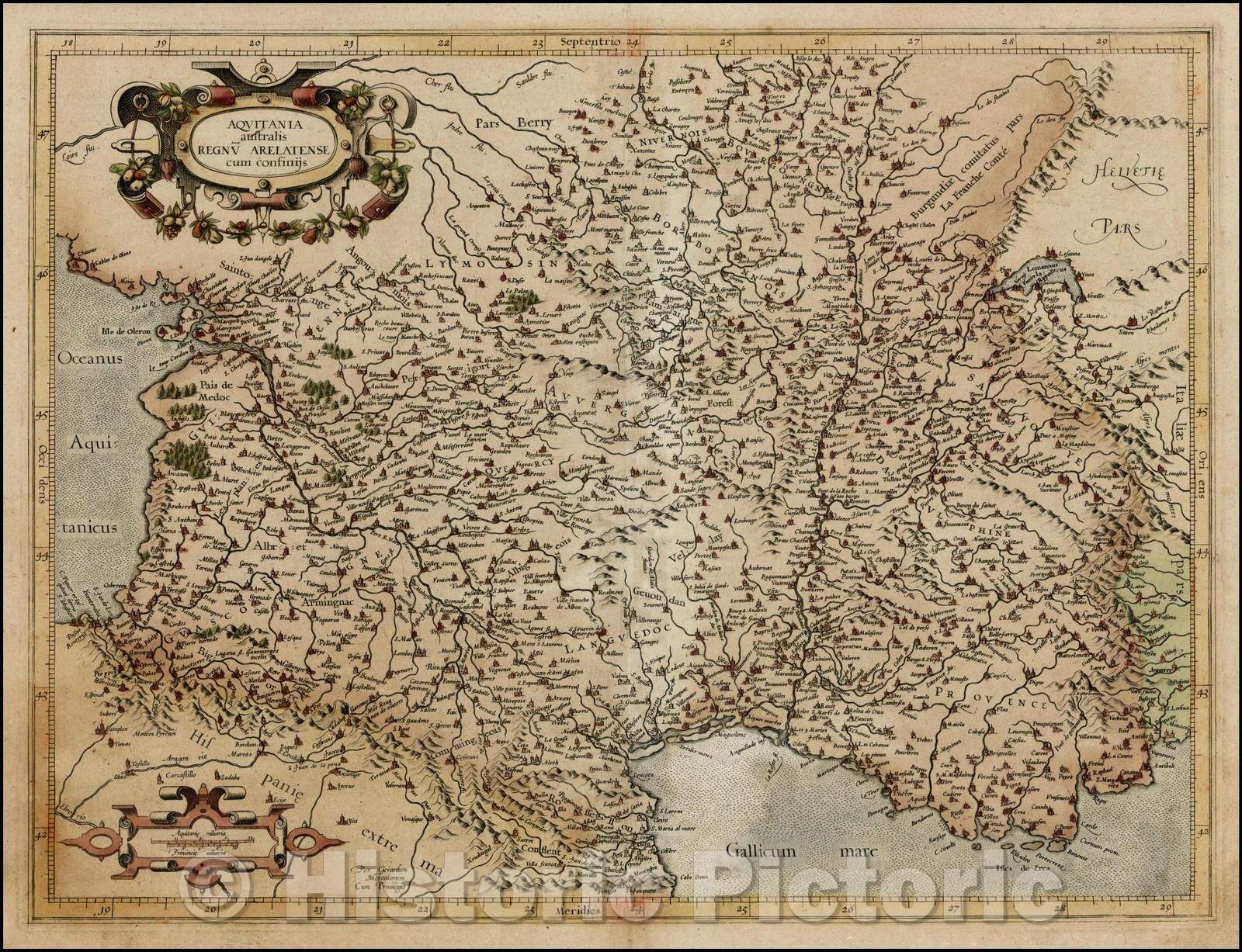 Historic Map - Aquitania australis Regnu Arelatense cum confinijs (South France)/Aquitaine australis Kingdom Arelatense cum confinijs (South Africa), 1595 - Vintage Wall Art